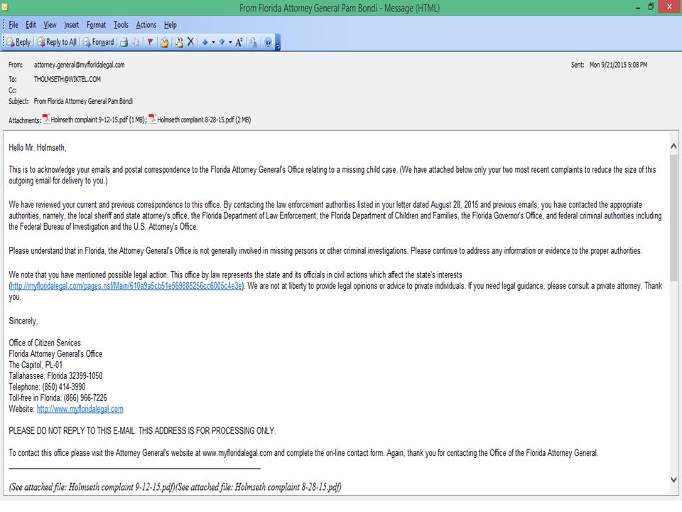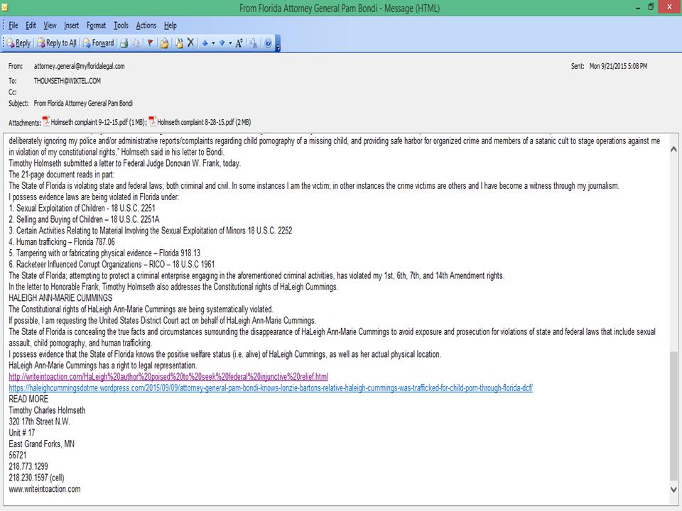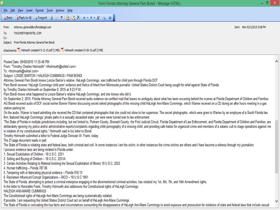 Florida Attorney General Pam Bondi has sent evidence submitted to her office by Timothy Charles Holmseth, to the Florida Department of Children and Families – Office of the Inspector General and the Florida Department of Law Enforcement (FDLE). On September 21, 2015, Bondi’s office contacted Inspector General Keith Parks and the FDLE. “The Florida Attorney General's Office received the attached correspondence from Timothy Holmseth in Minnesota, alleging that he has criminal information about a missing child/child abuse case,” said Becky Kring, deputy director, Office of Citizen Services. On September 28, Bondi’s office contacted Timothy Holmseth. “The issues you reported fall within the jurisdiction of Circuit Administration. As a result, your correspondence was forwarded to Interim Northeast Regional Managing Director Patricia Medlock for review and response to this office by October 16, 2015,” said Anissa F. Pitti, Office of Inspector General. Timothy Holmseth has submitted audio evidence to Florida law enforcement that captures a DCF social worker on tape discussing a CD she received in a gas station parking lot several months after missing child HaLeigh Cummings was reported vanished. According to an employee of a South Florida law office, the CD contained secret naked photographs of HaLeigh Cummings that the social worker, Bonnie Warner, openly admits on the tape, she could not show to her supervisor. The evidence shows there was a secret operation occurring within an underground of government and law enforcement officials that involved pornographic photographs. Other evidence submitted is a sworn affidavit from an Illinois resident that says she was contacted by the same law firm; given the contact information for a DCF worker named Annette Pitts, and then asked to file (fraudulent) DCF complaints against Ronald Cummings and Misty Croslin. Timothy Holmseth possesses all the emails and AT&T records between the Illinois resident and the South Florida law office. Timothy Holmseth has also provided transcriptions to Inspector Parks and FDLE Attorney James Martin of audio interviews he conducted in 2009 that might provide clues to law enforcement regarding the disappearance of Lonzie Barton in Jacksonville. Holmseth conducted interviews with a member the same aforementioned law office that seemed suspicious, because the person nervously brought up DCF; HaLeigh Cummings' mother and grandmother; the missing child Caylee Anthony; and a missing child organization operated by a person with the last name of “Barton”.